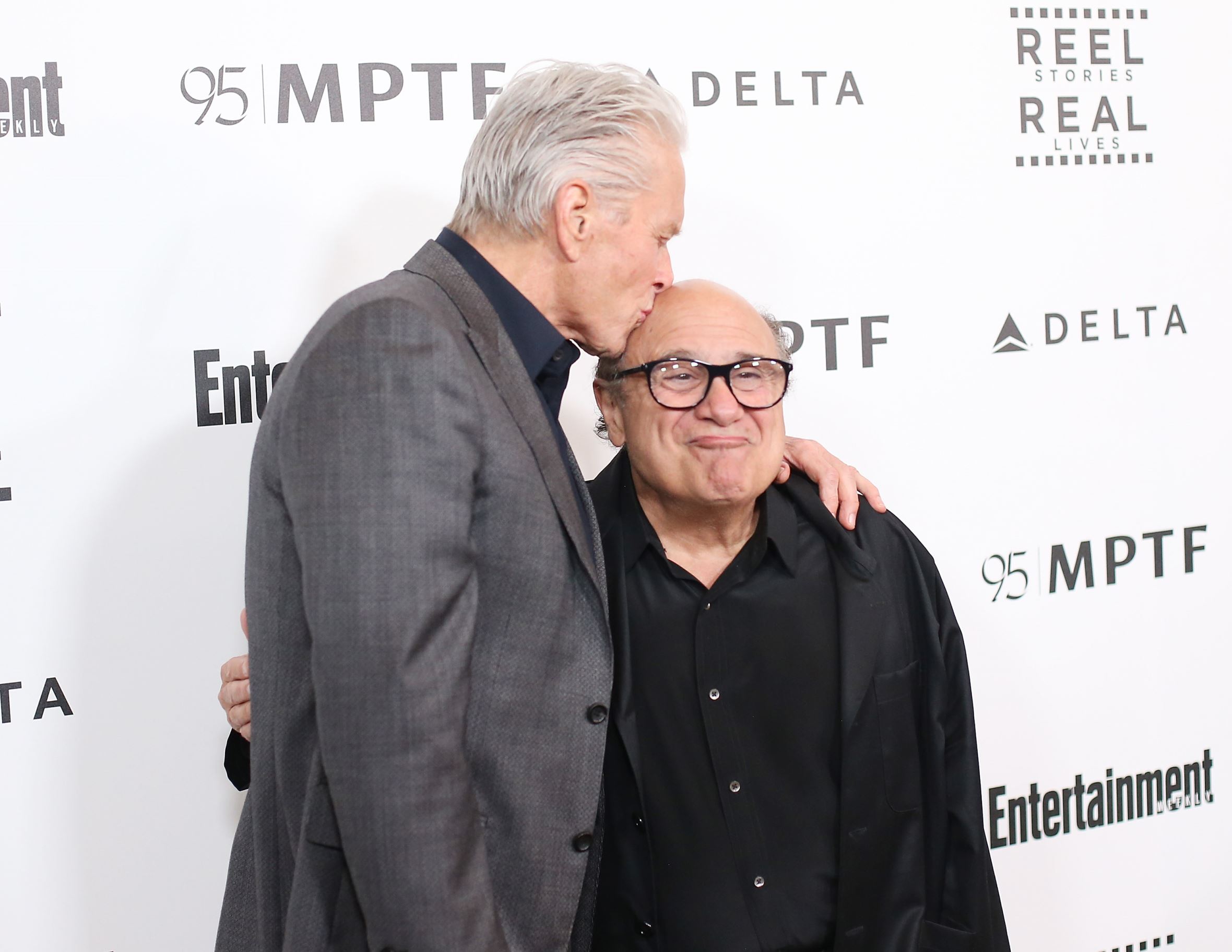 | Michael Douglas (kiri) mencium kepala Danny DeVito dalam acara Annual Reel Stories, Real Lives Benefiting MPTF di Los Angeles, California. |