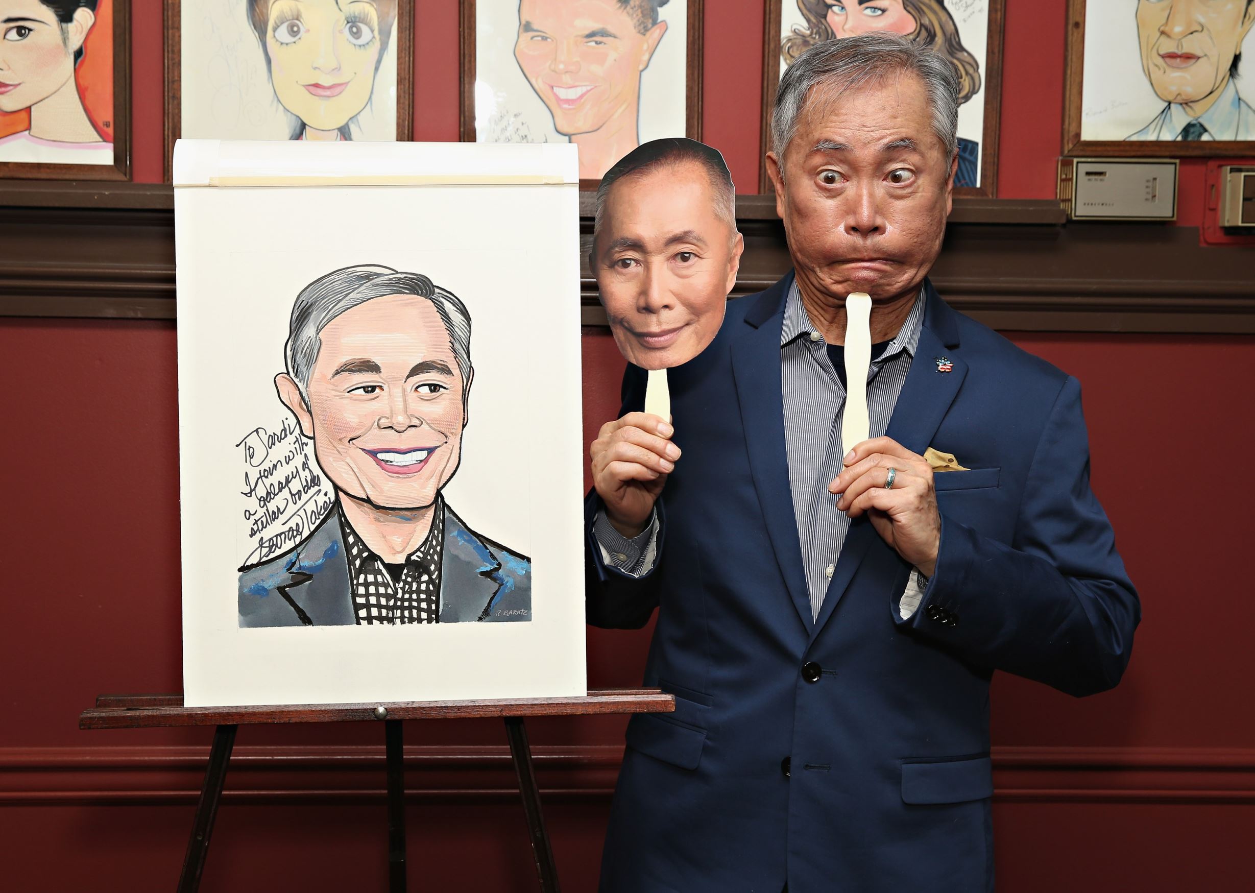 | Aktor George Takei berpose di samping karikatur dirinya di restoran Sardi di New York City. |